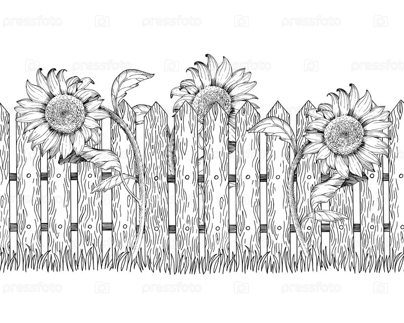 Бесшовный край подсолнечника, растущего рядом с забором. Ручная иллюстрация в стиле векторного чернила. Для дизайна упаковки, карт, обложек, принтов, этикеток на продуктах и тканей