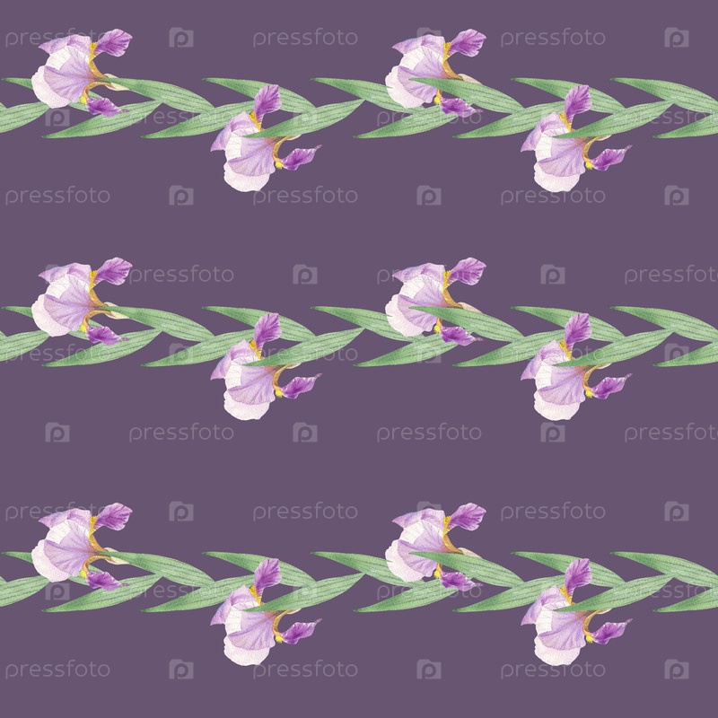 Бесшовный рисунок горизонтальных полос ирисов на фиолетовом фоне. Иллюстрация акварели ручной работы. Для дизайна упаковки, карт, обложек, принтов, этикеток продуктов и тканей
