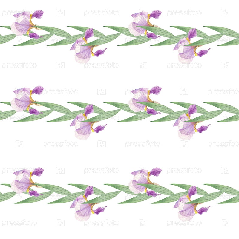 Бесшовный рисунок горизонтальных полос ирисов. Иллюстрация акварели ручной работы. Для дизайна упаковки, карт, обложек, принтов, этикеток на продуктах и тканей