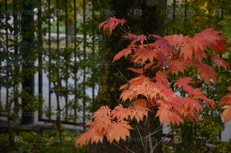 Кленовый японский аконитифолиум (Acer japonicum Aconitifolium) с красными осенними листьями в Ботаническом саду Петра Великого в Санкт-Петербурге