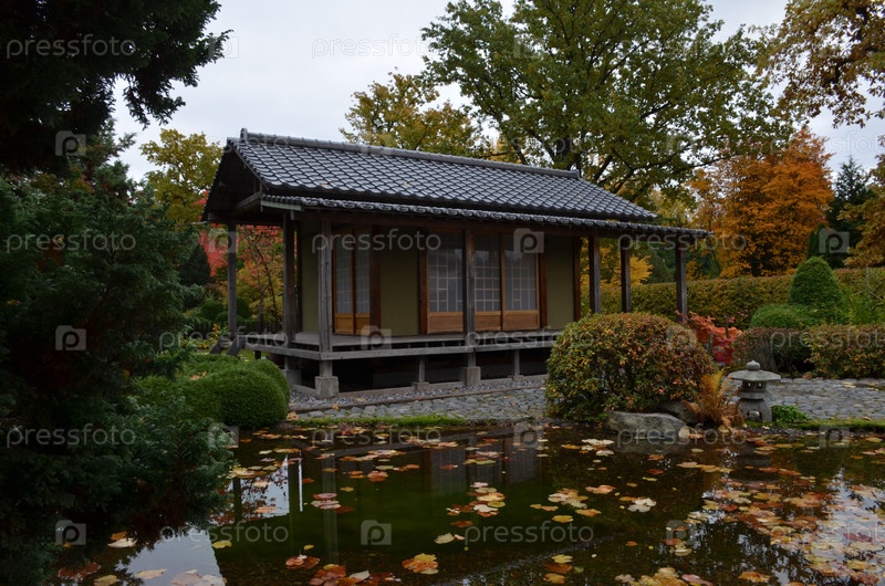 Чайный павильон в японском саду Петра Великого Ботанический сад в Санкт-Петербурге осенним днем