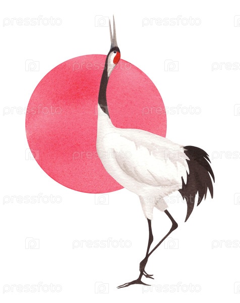 Танцующий красный японский кран с солнцем на фоне Иллюстрация акварели ручной работы Для ткани, обоев, поздравительных открыток, дизайна, декора и иллюстрации