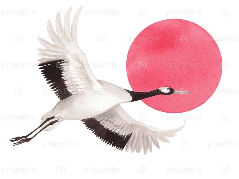 Летающий японский красный коронный кран с солнцем на фоне. Иллюстрация акварели ручной работы. Для ткани, обоев, поздравительных открыток, дизайна, декора и иллюстрации