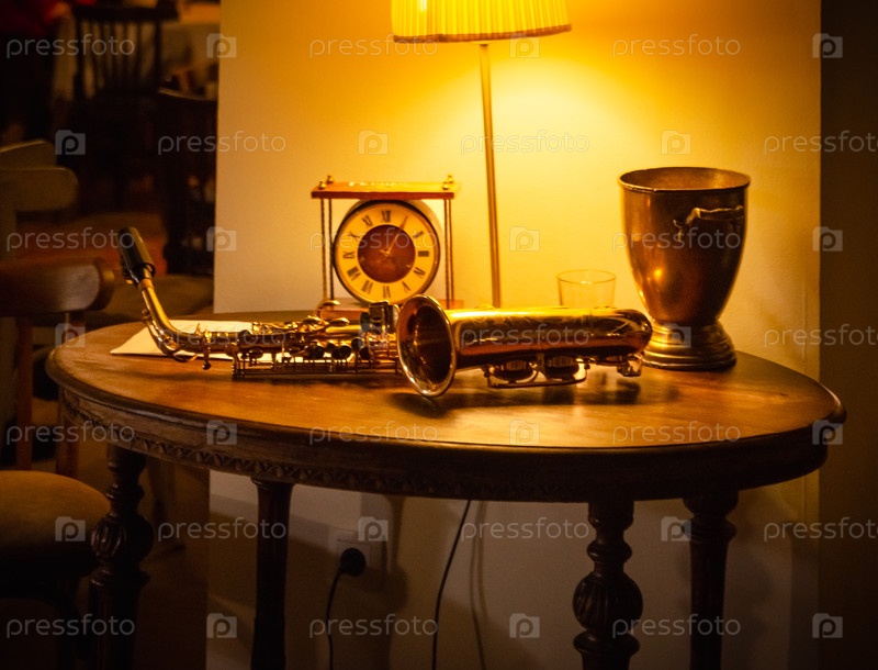 Романтический вечер натюрморта: саксофон на старом столе под теплым светом лампы