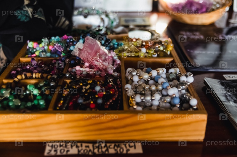 Многоцветные бусы и рукодельные браслеты в деревянной коробке на ярмарке