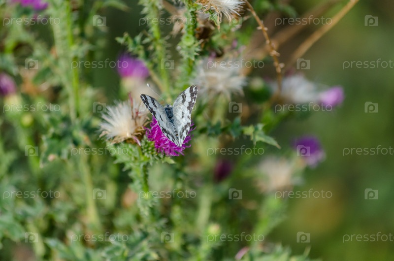 Капуста бабочка белая с черными пятнами на фиолетовом жести