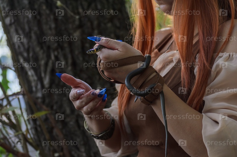 Рыжеволосая девушка держит маленькую змею в лесу