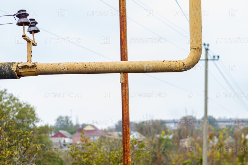 Старые газопроводы и изоляторы на фоне осеннего пейзажа