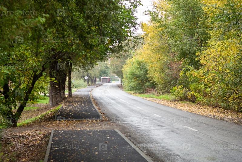 Тихая деревенская улица ранней осени с деревьями в желтых листьях