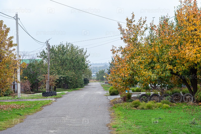 Тихая деревенская улица ранней осени с деревьями в желтых листьях
