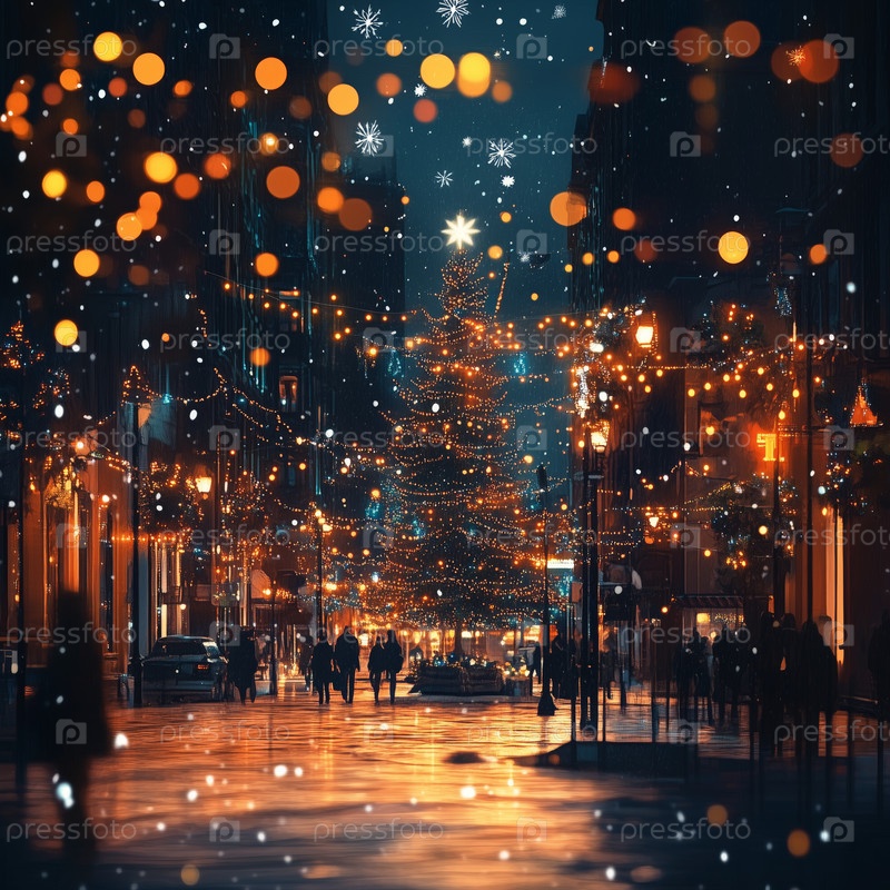 Улица праздничного города с яркими огнями и снегом
