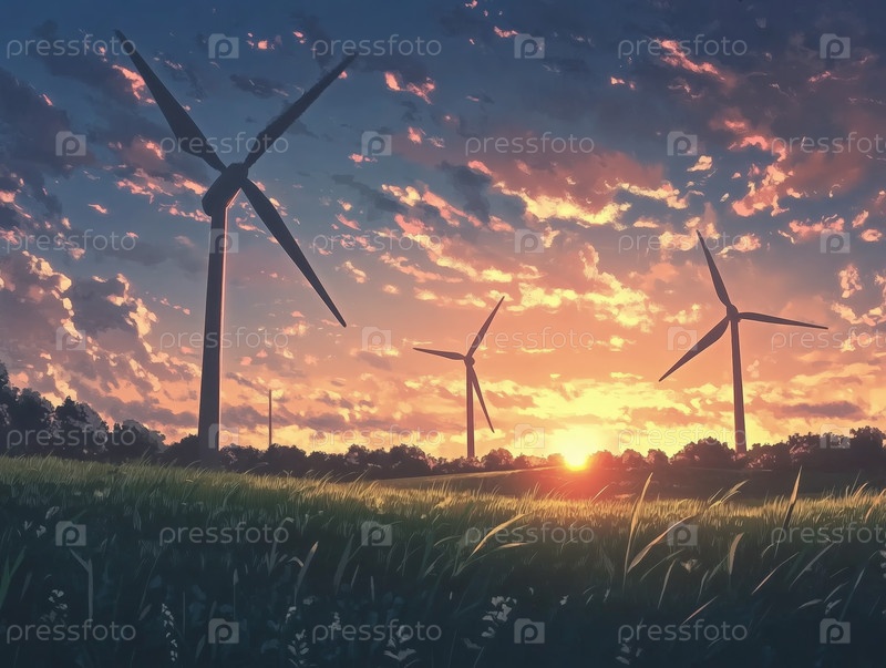 Ветряные турбины в поле на закате с ярким небом