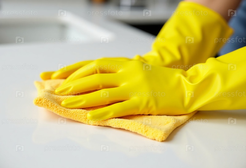Руки в ярко-желтых резиновых перчатках нежно протирают кухонную столешницу мягкой тканью, обеспечивая блестящую и гигиеническую поверхность для кулинарной деятельности