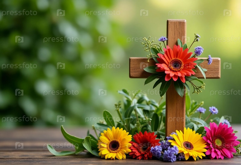 Красочные цветы в оттенках желтого, красного и фиолетового цвета украшают деревянный крест на пышном зеленом фоне, приглашая к созерцанию и спокойствию