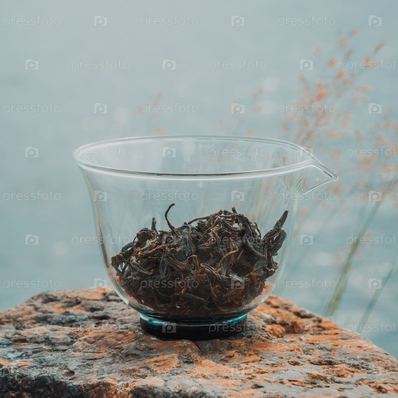 Детальный крупный план сушеных листьев травяного чая, представленных в красивой стеклянной миске на спокойном естественном фоне
