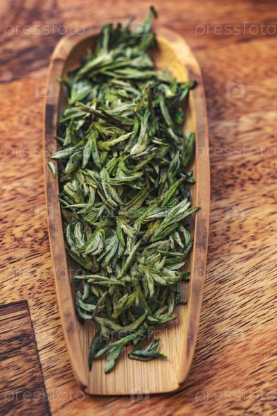 Эстетическое изображение сушеных листьев зеленого чая, расположенных в деревянной блюде на очаровательной столешнице