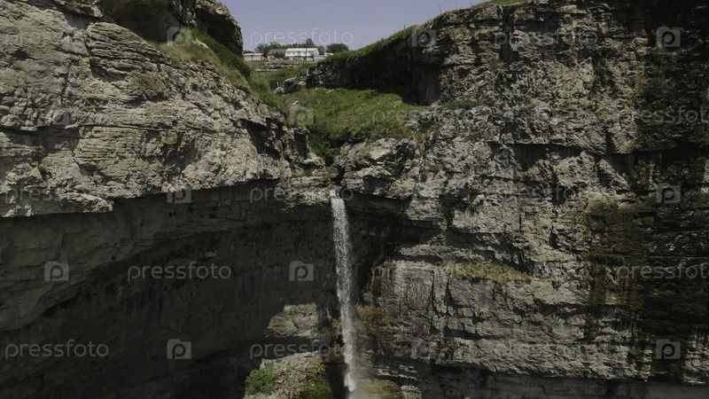 Узкий водопад падает с высокой скалы. Идите дальше. Вид сверху на воду от рук, падающих в водопад. Река опускается и становится водопадом в горах. Красивая скалистая скала с узким водопадом