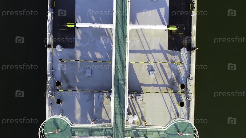 Вид сверху на палубу грузового судна, плавающего по реке. Кадры. Красивая грузовая лодка с длинной просторной палубой для больших грузов. Внутренний грузовой водный транспорт