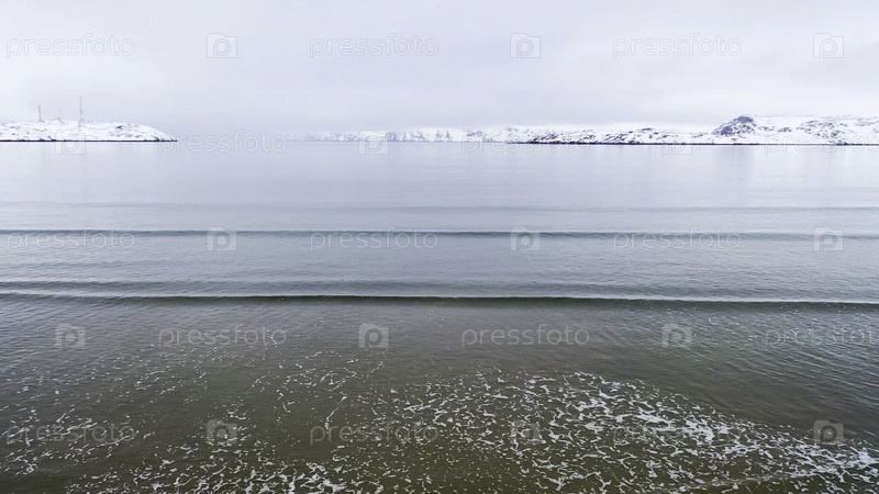 Прекрасная зимняя панорама тихого голубого моря на фоне снежного побережья
