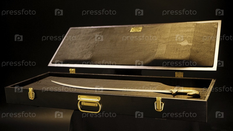 Экспозиция в музее представляет собой старый меч на изолированном фоне. резервные кадры. Старый меч в открытом чемодане как экспонат в музее оружия или народной жизни