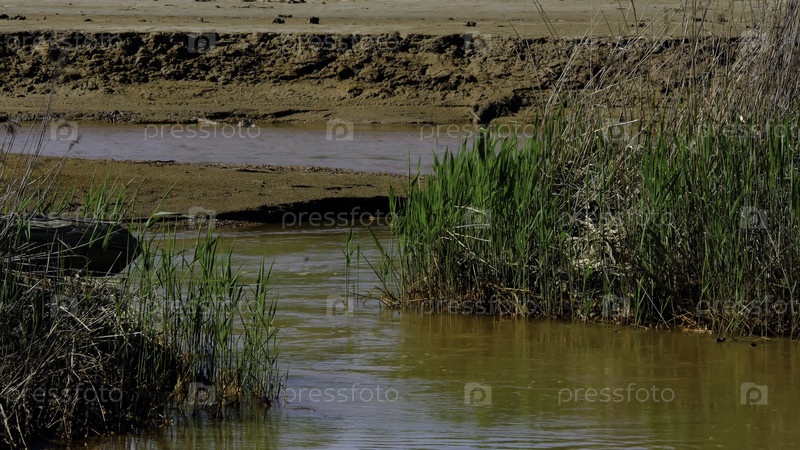 Грязная река течет через пустыню. Резервные кадры. Река с поворотами протекает через необитаемую глиняную местность с болотистой травой в устье