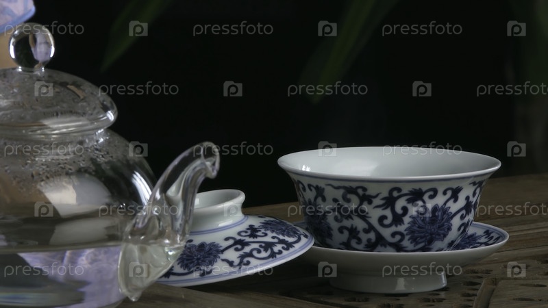 Процесс заваривания чая, чайная церемония, чашка свежеприготовленного черного чая. азиатский чай на бамбуковом коврике. китайцы из литой кастрюли