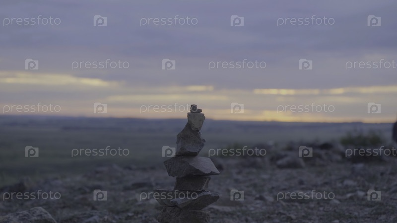 Песчаные камни Зенская башня и баланс. кучка камней против неба. каменная башня на фоне поля и утреннего неба