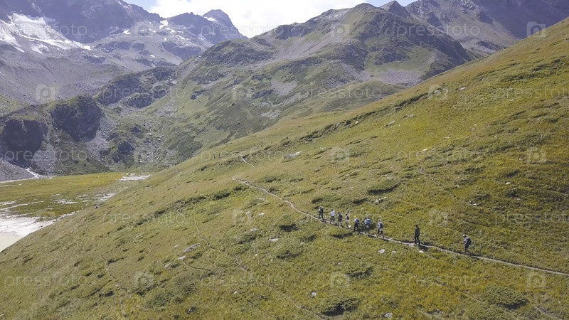 Вид на группу туристов, идущих по горной тропе. Клип. Алпинисты идут вдоль предгорья с желтой травой. Прекрасный пейзаж горы со снежными вершинами, открытыми для альпинистов