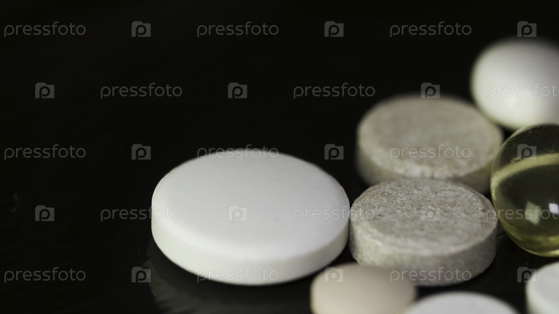 Фармацевтический фон на темном столе. Левитационные таблетки. Таблетки на тёмном фоне, которые падают вниз. Пилюли. Медицина и здоровье. Закрыть капсулы. Таблетки, падающие на черный фон