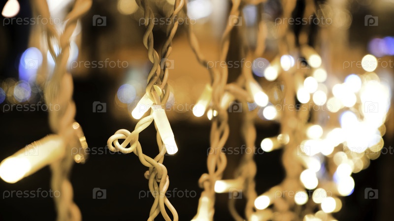 Гирлянды из гирлянд сияют снаружи ночью.Концепция.Прекрасное светящееся и мерцающее освещение гирлянда на фоне городской ночи