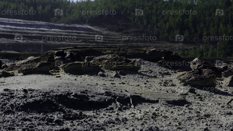 Камни на фоне карьера. резервные кадры. Скалистый рельеф заброшенного карьера с минералами на поверхности против лесного фона