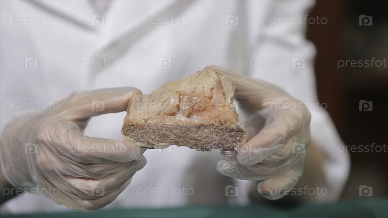 Дикий аметист в руках женщин в белых перчатках. камень в руке