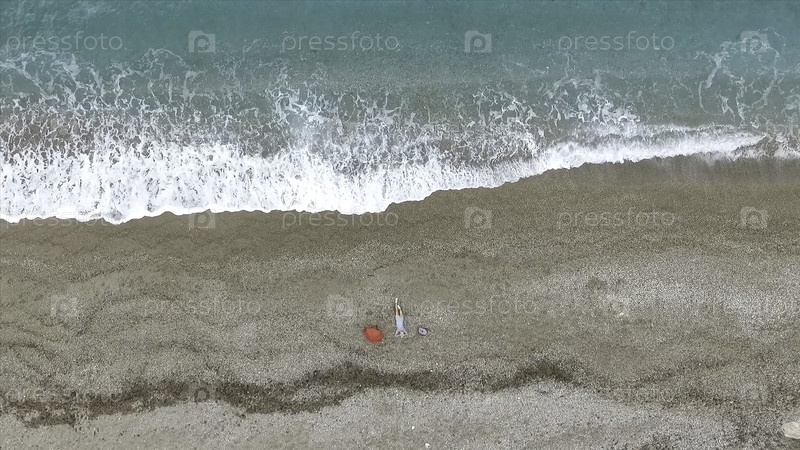 Молодая женщина лежит на спине возле волн голубого моря