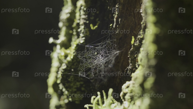 Большая паутина, на дереве, на утренней росе, на естественном фоне, очень сильная паутина
