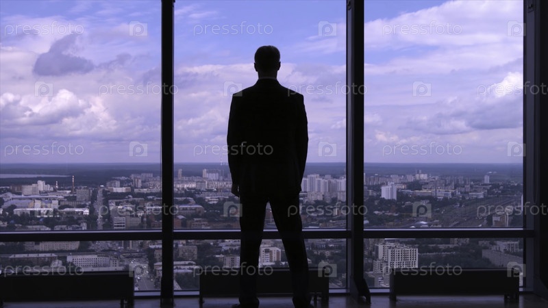 Бизнесмен в костюме стоит рядом с большим окном офисного здания и смотрит на часы
