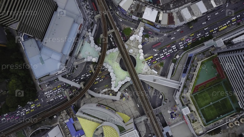 Вид сверху города и Бангкокский небесный поезд, выходящий со станции