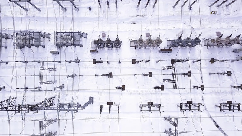 Ряд электрических столбов. Идите вперед. Вид на электростанцию с рядом трансформаторов зимой. Мощная электростанция с новым оборудованием зимой. Электроэнергия