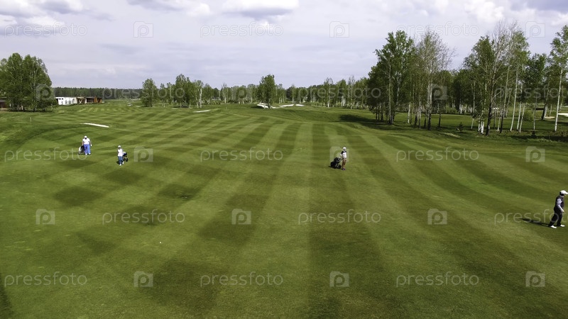 Игроки в гольф прогуливаются по фервей на поле с сумкой для гольфа и тележкой