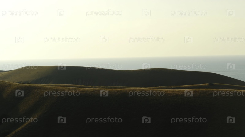 Вид с воздуха на высокие зеленые холмы и голубое море на фоне вечернего неба летом.Снимать.Удивительный красочный пейзаж