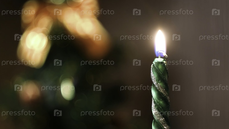 Закрытие праздничной свечи на фоне размытых огней.Концепция.Ясное внимание к светильнику горит среди праздничных красочных расплывчатых огней