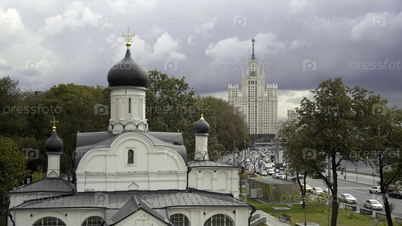 Купола белой церкви на фоне городской дороги и старого здания. продолжайте. ландшафт города с церковью и высокое здание со старым архитектурой против облачного неба