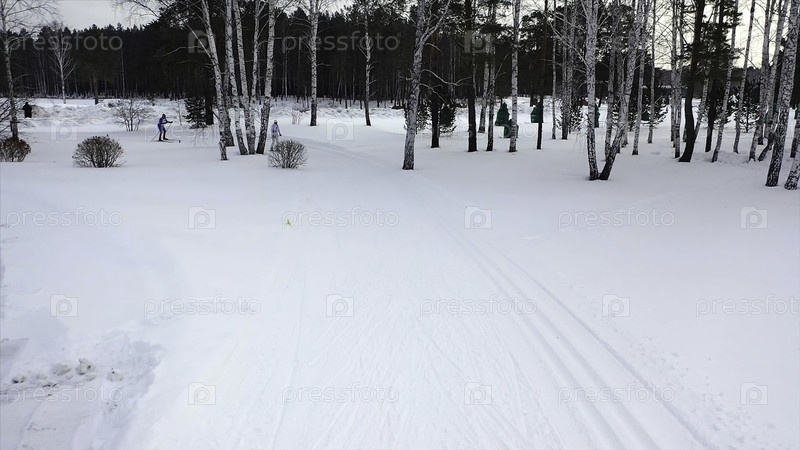 лыжные гонки на трассе зимой. кадры. вид профессиональных лыжников, соревнующихся в красочных костюмах на трассе. зимние соревнования по лыжному спорту