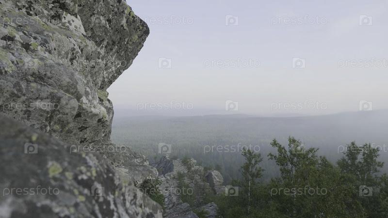 Внешняя перспектива природного ландшафта. Массивные скалы и вид на долину летом. Вид с скал