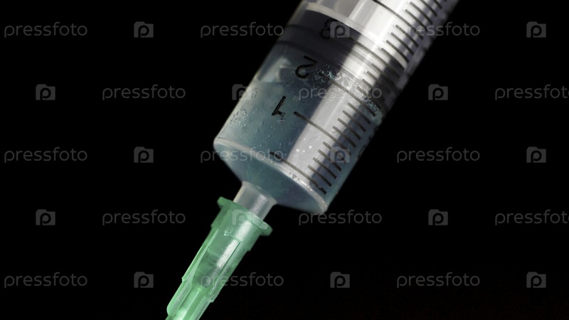 Прием вакцины в стеклянном шприце из ампулы на черном фоне. Закрыть. Шприц вводится как инъекции бирюзовой жидкости от болезни серьезных заболеваний, концепция медицины