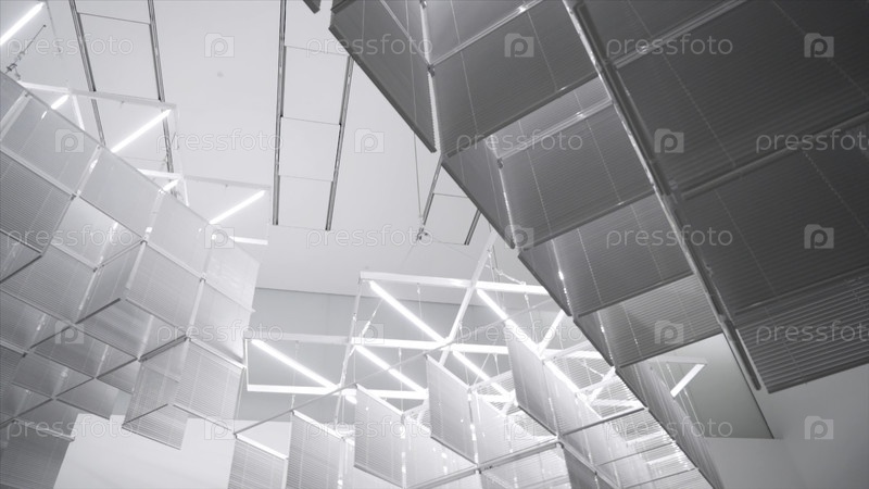 Белая комната с ярким светом и висящими инсталляциями.Продолжайте.Белая комната с необычными висячими установками и зеркалами, освещенными ярким освещением в Музее современного искусства