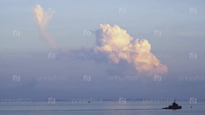 Вид проходящего корабля недалеко от морского берега.Стреляйте.Прекрасный вид на море и облака