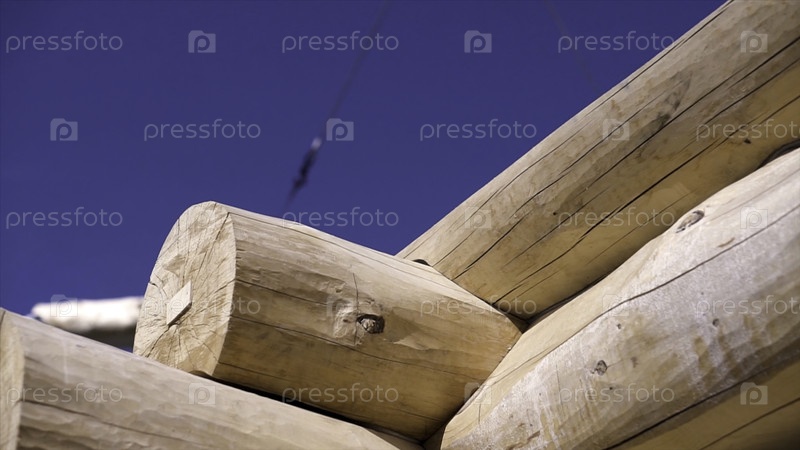 Закройте деревянный дом и кран с помощью древесины. Клип. Деревянный дом под строительством против бревенчатого крана. Деревянное здание дома напротив голубого неба