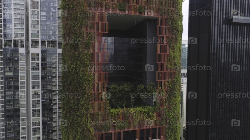 Традиционные китайские магазины Peranakan и современная архитектура отеля Oasia. Съемка. Вид на многоэтажные офисные небоскребы и частные жилые районы в окрестностях Tanjong Pagar