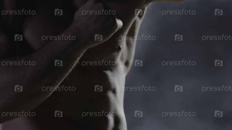Мускульный кикбоксер или боец муай тай, пробивающийся через дым