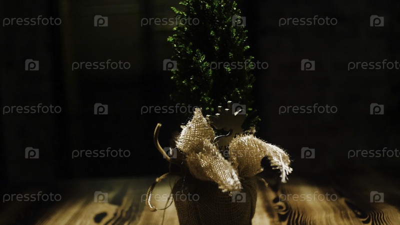 Маленькая зеленая елка в горшке на темном фоне. рама. декоративная рождественская ёлка в мешочке на деревянном столе в темной комнате. атмосфера магии и рождественских праздников